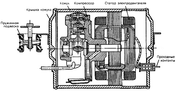 Компрессор вместе с электродвигателем помещен в стальном кожухе. Кожух представляет собой трубу, закрытую с обеих сторон наглухо приваренными крышками. Внутри кожуха имеется выступ, по одну сторону которого запрессован компрессор, по другую — статор двигателя.