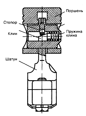 Поршневой палец прикреплен к верхней головке шатуна при помощи стопора, который частично входит в отверстие верхней головки. Стопор опирается противоположным концом на наклонную плоскость клина, находящегося в торцовом отверстии пальца и поджимаемого пружиной. Такое крепление пальца обеспечивает надежное соединение и бесшумность работы.